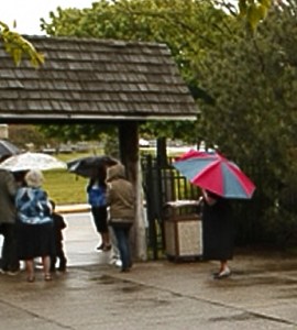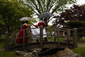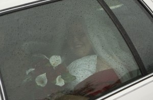 She got out of the car, her dad anxiously wielding an umbrella, her sisters scrambling to keep her dress off the ground. The last few guests passed by her, carrying their own protection from the weather and trying to smile at her as if they weren’t all being drizzled on. She looked around at the wedding party in their fancy outfits, huddling under any cover they could find.